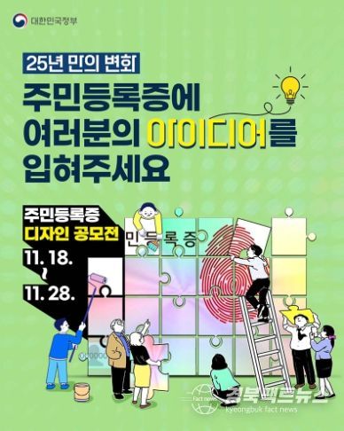 경북팩트뉴스 이경원 기자 | 25년 만의 변화, 주민등록증에 여러분의 아이디어를 입혀주세요. 오는 11월 18일부터 28일까지 주민등록증 디자인 공모가 진행돼요. 이번 공모는 국민 모두 참여할 수 있는데요, 두 가지로 나누어 개최된답니다.