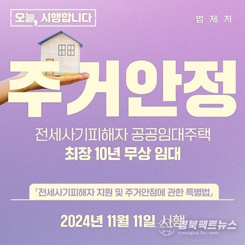 경북팩트뉴스 이경원 기자 | 전세사기피해자의 실질적 주거 안정을 위한 공공주택사업자는 전세사기피해자의 우선매수권을 양도받아 공공임대주택으로 우선 공급합니다. 임대료 부담 없이 10년간 거주할 수 있으며 경매·공매에 따라 발생하는 차익은 임대료로 사용됩니다.