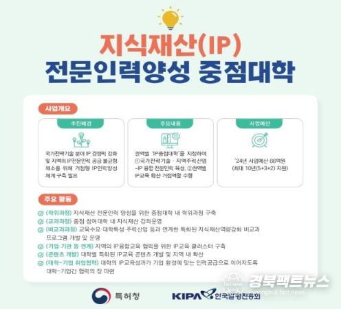 경북팩트뉴스 김영란 기자 | 특허청은 11월 13일 14시 10분 한국지식재산센터(서울시 강남구)에서 ‘지식재산 전문인력양성 중점대학(이하 IP중점대학)’으로 새롭게 선정된 3개 대학과 지식재산 중점대학 사업 협력을 위한 업무협약을 체결했다.