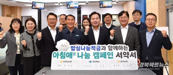 경북팩트뉴스 이경원 기자 | 경상북도와 농협중앙회 경북본부는 18일 서안동농협 신도청지점에서 건강한 쌀 소비문화 확산을 위한 사회공헌형 상품 ‘밥心나눔적금’ 가입행사를 열었다.