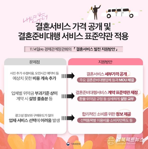 경북팩트뉴스 이경원 기자 | 내년부터 결혼서비스 가격 공개 및 결혼준비대행 서비스 표준약관 적용됩니다.