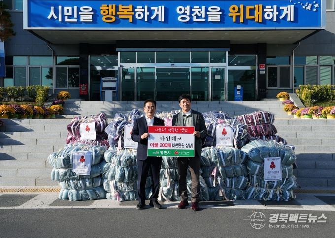 경북팩트뉴스 김영란 기자 | 영천시(시장 최기문)는 22일 다인데코(대표 장석주)에서 이불 200채(2천만원 상당)를, 대창면 따숨가게 회원 4명(김봉섭·여운일·강덕철·황정숙)이 이웃돕기 성금 200만원을 기탁했다고 밝혔다.