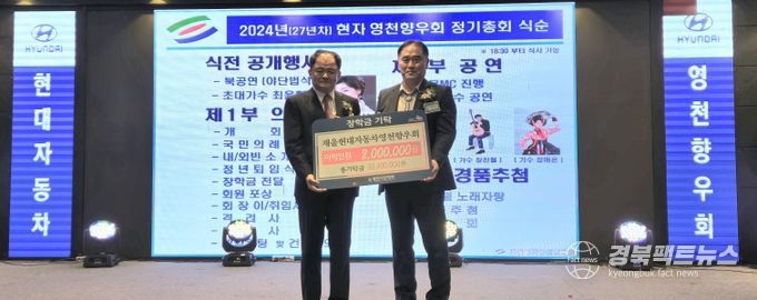 재울현대자동차영천향우회는 400명의 회원들과 함께 정기총회 및 정년퇴임식 행사를 개최했다. 회장 이취임식 및 공로자에 대한 시상과 함께 지역인재 육성을 위한 200만원의 장학금을 기탁해, 2007년 장학금을 기탁한 이래로 올해까지 18회 총 3,040만원의 장학금을 기탁했다. 정창봉 신임회장은 “어려운 상황에 있는 학생들이 꿈과 희망을 잃지 않고 학업을 이어나갔으면 하는 바람에서 작은 정성을 모아 장학금을 기탁하게 됐다”고 전했다.
