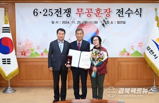 경북팩트뉴스 이경원 기자 | 김천시는 2024년 11월 25일 김천시청 접견실에서 6.25전쟁에서 국가와 국민을 위해 헌신하고 돌아가신 무공수훈자의 유족에게 6.25전쟁 무공훈장을 전수하는 전수식을 개최했다.