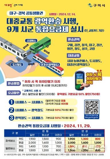 통합요금제에 따라 구미, 대구, 경산, 영천, 김천, 칠곡, 성주, 고령, 청도 총 9개 자치단체의 일반버스 교통카드 요금이 동일하게 적용된다. 요금은 △성인 1,500원 △청소년 850원 △어린이 400원으로 통일되며, 기존의 시계외 요금은 폐지된다. 특히 구미시는 좌석버스 요금을 청소년 기준 1,500원에서 1,300원으로, 어린이는 900원에서 800원으로 인하하며 시민들의 교통비 부담을 한층 덜었다.