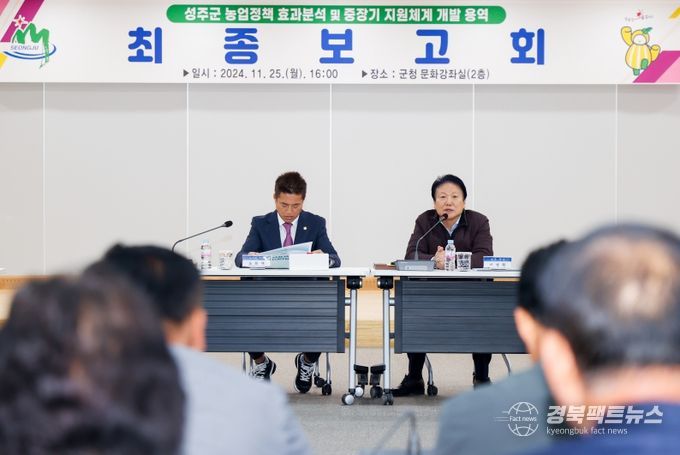 경북팩트뉴스 김영란 기자 | 성주군은 11월 25일 군청 문화강좌실에서 60여명의 생산자(작목반), 농업인 단체 대표, 농협군지부장 및 조합장 등이 참석한 가운데『성주군 농업정책 효과분석 및 중장기 지원체계 개발용역』최종보고회를 개최했다.