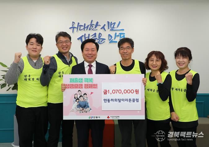 경북팩트뉴스 김영란 기자 | 안동 하회탈 마라톤 클럽은 ‘저출생 극복 성금모금 캠페인’에 동참하고자 저출생 극복 성금 107만 원을 11월 25일 안동시에 전달했다.