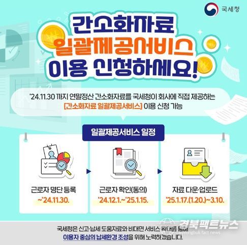 경북팩트뉴스 이경원 기자 | ’24.11.30 까지 연말정산 간소화자료를 국세청이 회사에 직접 제공하는 '간소화자료 일괄제공서비스' 이용 신청 가능합니다.