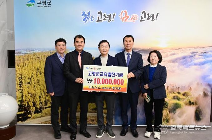 경북팩트뉴스 김영란 기자 | 11월 27일 리뉴어스에서 고령군청을 방문하여 지역의 교육 발전과 인재 양성을 위해 사용해 달라며 교육발전기금 1,000만원을 기탁했다.