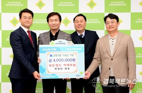 경북팩트뉴스 김영란 기자 | 경산시는 28일, 경산 · 청도 미래포럼의 임원진 4명이 각 100만 원씩 총 400만 원의 고향사랑기부금을 전달했다고 밝혔다.