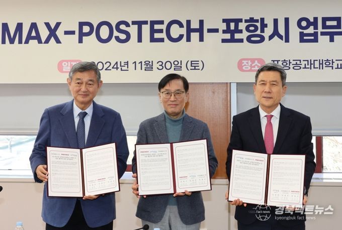 경북팩트뉴스 김영란 기자 | 포항시와 코스맥스(COSMAX), 포항공과대학교(POSTECH)는 지난 30일 포항공과대학교 대학 본부에서 화장품 산업의 신성장동력 발굴 및 바이오산업 발전을 위한 업무협약식을 가졌다.