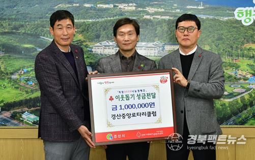경북팩트뉴스 김영란 기자 | 경산중앙로타리클럽은 2일 경산시청을 방문해 '희망2025나눔캠페인'에 동참하고자 이웃돕기 성금 100만 원을 기탁했다.
