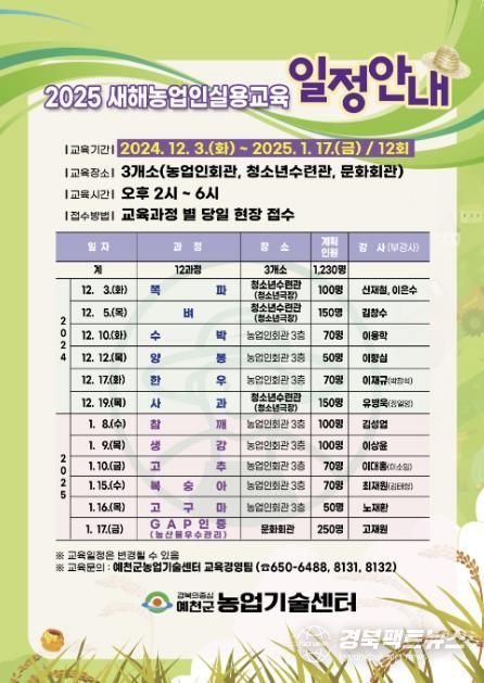 경북팩트뉴스 김영란 기자 | 예천군은 3일을 시작으로 내년 1월 17일까지 ‘2025년 새해농업인실용교육’을 실시한다.