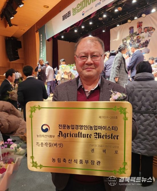 경북팩트뉴스 김영란 기자 | 봉화군 봉성면 우곡리에서 버섯농장을 경영하는 권혁로 대표(품은들농장)가 지난달 28일 농림축산식품부에서 지정하는 제6회 농업마이스터 지정식에서 특용작물분야 버섯품목 마이스터로 지정됐다.