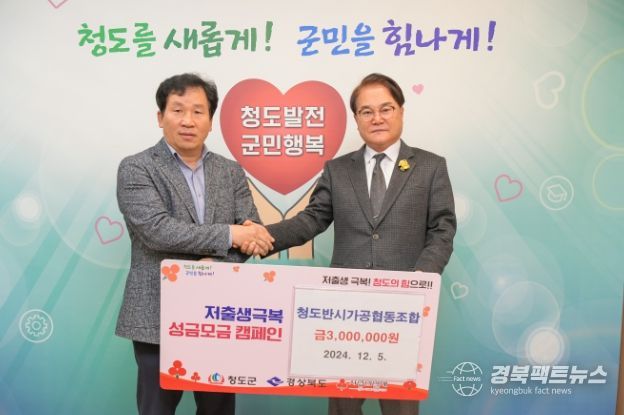 경북팩트뉴스 김영란 기자 | 청도군 청도반시가공협동조합(대표 예정수)은 5일 청도군 저출생 극복을 위해 성금 300만 원을 청도군에 기탁했다.