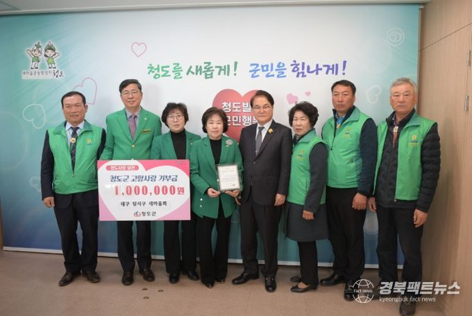경북팩트뉴스 김영란 기자 | 청도군은 지난 6일 대구시 달서구 새마을회(회장 진덕수)가 고향사랑 기부금 100만 원을 군에 기탁하며 지역 간의 화합과 나눔을 실천했다고 밝혔다.
