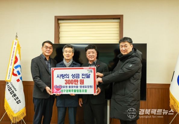 경북팩트뉴스 김영란 기자 | 대구경북주물협동조합에서 12월 9일 관내 사회복지시설 대창양로원·들꽃마을·영생요양원에 각 100만원씩 300만원을 전달했다. 대구경북주물협동조합은 매년마다 어려운 이웃을 위해 성금을 기탁하고 있어 지역사회 나눔문화 활성화에 좋은 귀감이 되고 있다.