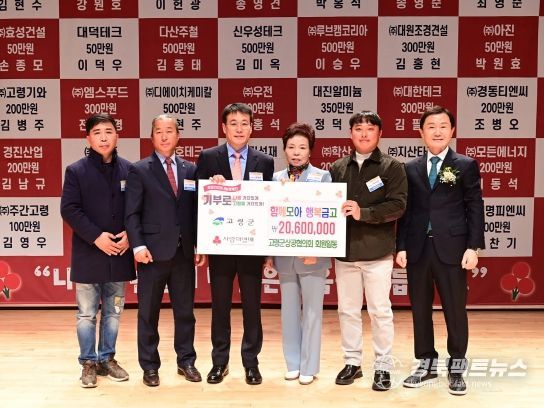 경북팩트뉴스 김영란 기자 | 고령군 상공협의회는 12월 12일 대가야문화누리 가야금홀에서 개최된 정기총회에서‘함께모아 행복금고’성금 2,060만원을 기탁했다. 이번 기탁은 고령군 상공협의회에 소속된 48개 업체가 합동으로 모아서 ‘함께모아 행복금고’성금을 기탁했다.