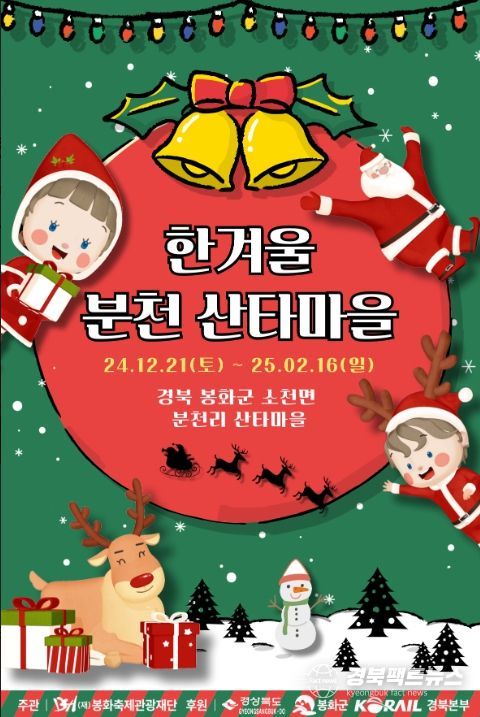 경북팩트뉴스 이경원 기자 | (재)봉화축제관광재단이 주최·주관하고 경상북도, 봉화군, 코레일 경북본부가 후원하는 봉화의 대표 겨울 축제 ‘2024-2025 한겨울 분천산타마을’이 오는 12월 21일부터 2025년 2월 16일까지 58일간 봉화군 소천면 분천산타마을 일원에서 운영된다.