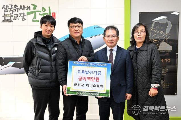경북팩트뉴스 김영란 기자 | 지난 11일 군위군테니스협회 김윤겸 회장은 군위군청을 방문하여 지역의 교육 발전과 인재양성을 위해 써달라며 교육발전기금 200만원을 기탁했다.