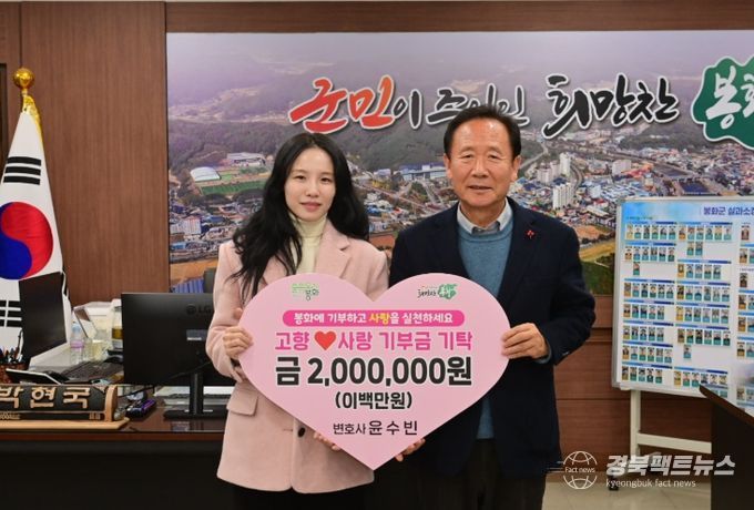 경북팩트뉴스 김영란 기자 | 봉화 출신의 윤수빈 변호사가 지난 13일 봉화군청을 방문해 고향사랑기부금 200만 원을 기탁했다.