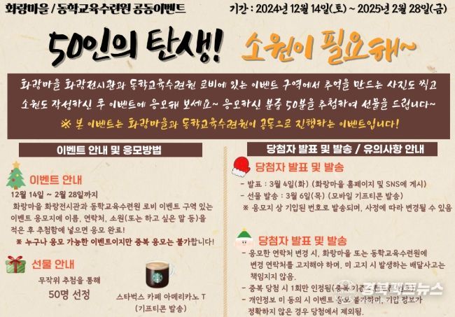 당첨자 50명은 내년도 3월 4일 화랑마을 홈페이지 및 SNS에 게시한다. 이들에게는 모바일 기프티콘이 발송된다.