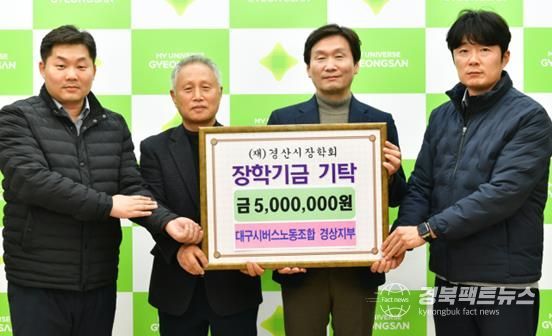 경북팩트뉴스 김영란 기자 | (재)경산시장학회는 대구시버스노동조합 경상지부가 13일 인재육성을 위한 장학기금 500만원을 기탁했다고 밝혔다.