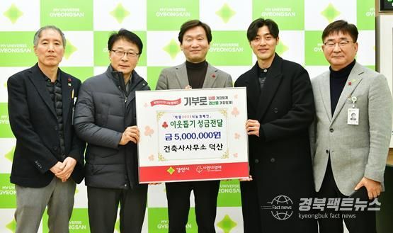 경북팩트뉴스 김영란 기자 | 경산시 중방동 소재 건축사사무소 덕산은 17일 경산시청을 방문해 이웃돕기 성금 500만 원을 기탁했다.