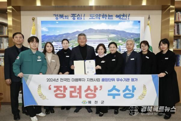 경북팩트뉴스 김영란 기자 | 예천군은 마음건강돌봄 및 자살 예방을 위해 추진 중인「2024년 전국민 마음투자 지원사업」중앙단위 평가에서 장려상을 수상했다고 밝혔다.