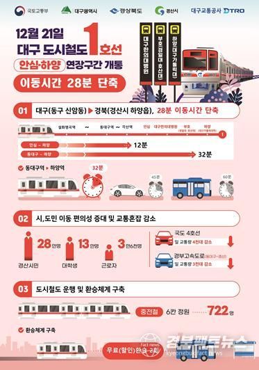 이번 연장구간 개통으로 경산 하양에서 대구 도심(동대구역)까지 이동시간이 기존 60분에서 32분으로 단축돼, 경산과 대구를 오가는 시민들의 교통 여건이 획기적으로 개선될 전망이다.