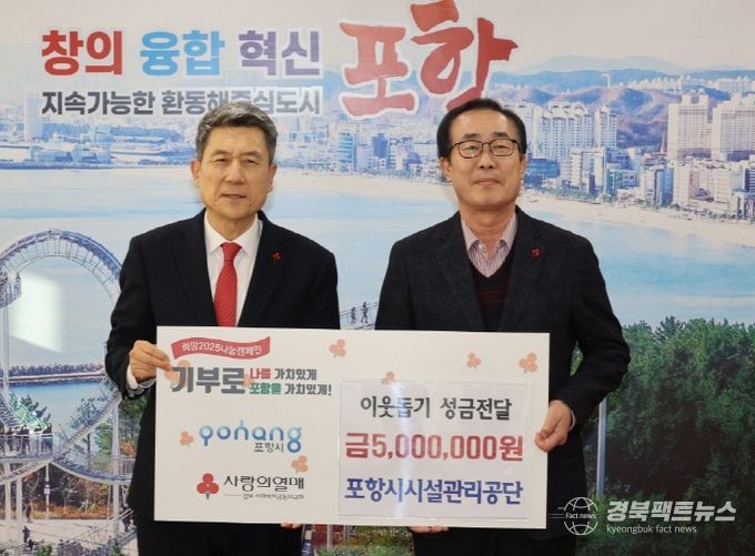 경북팩트뉴스 김영란 기자 | 포항시시설관리공단은 지난 18일 ‘희망2025 나눔캠페인’ 이웃돕기 성금 500만 원을 시청 대외협력실에서 기탁했다.