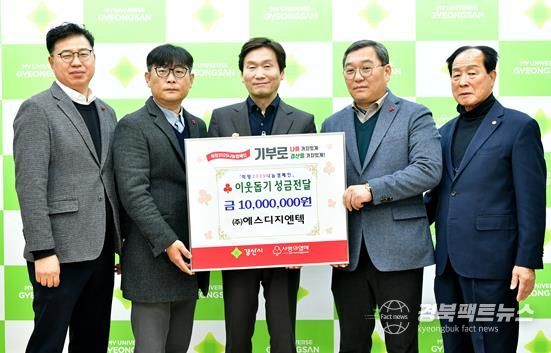 경북팩트뉴스 김영란 기자 | 경산시 진량읍 소재 ㈜에스디지엔텍은 19일 경산시청을 방문해 관내 저소득층을 돕기 위한 이웃돕기 성금 1천만 원을 기탁했다.
