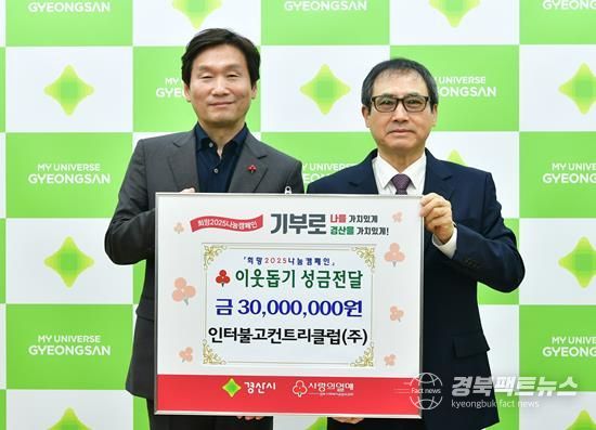 조현일 경산시장은 “항상 잊지 않고 경산시를 위해 따뜻한 나눔을 실천해 주시는 인터불고컨트리클럽(주)에 깊은 감사의 마음을 전한다”며, “기탁해 주신 성금은 꼭 필요한 곳에 소중히 전달하겠다”고 밝혔다.