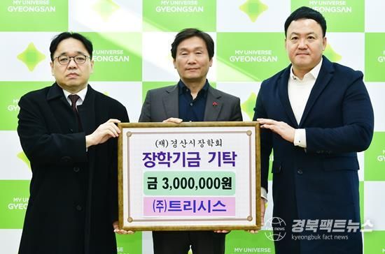 경북팩트뉴스 김영란 기자 | (재)경산시장학회는 19일, ㈜트리시스에서 경산시 인재 육성을 위해 장학금 300만 원을 기탁했다고 밝혔다.