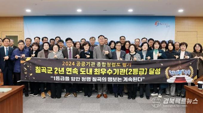 경북팩트뉴스 김영란 기자 | 칠곡군은 국민권익위원회가 주관한 ‘2024년도 공공기관 종합청렴도 평가’에서 2년 연속 도내 최우수기관(2등급)을 달성했다고 20일 밝혔다.