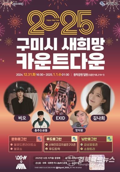 경북팩트뉴스 이경원 기자 | 구미시는 오는 31일 오후 4시부터(본행사 23시 30분) 동락공원 광장에서 ‘2025 구미시 새희망 카운트다운’ 행사를 개최한다. 이번 행사는 2024년 갑진년 한 해의 아쉬움을 달래고, 2025년 을사년 새해의 희망을 함께 맞이하기 위해 마련됐다.
