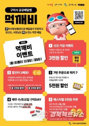 구미시는 2억 원을 지원해 △신규 가입자 대상 3,000원 할인 △매주 수·토요일 4,000원·3,000원 할인 △최대 4,000원까지 적용되는 더블할인 △7번 주문으로 럭키 7 이벤트 등 다양한 정기 할인 행사를 운영하고 있다. 이와 함께 ‘2025 아시아육상선수권대회’ 등 구미시 주요 행사와 연계한 비정기 할인 이벤트(5,000원 지급)를 통해 소비자 혜택을 더욱 강화할 예정이다.