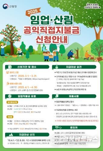 경북팩트뉴스 조현묵 기자 | 울진군은 2025년 임업·산림 공익직접지불금 신청·접수를 2025년 3월 1일부터 4월 30일까지 진행한다.