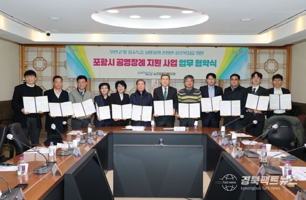 경북팩트뉴스 조현묵 기자 | 포항시는 20일 시청 중회의실에서 포항시읍면동지역사회보장협의체 및 포항의료원, 포항성모병원, 포항세명기독병원 장례식장 등 10개 장례식장과 ‘포항시 공영 장례 지원사업 업무 협약’을 체결했다.
