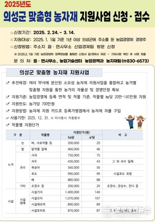경북팩트뉴스 조현묵 기자 | 의성군은 2025년 의성군 맞춤형 농자재 지원사업 신청을 2월 24일(월)부터 3월 14일(금)까지 실시한다고 밝혔다.