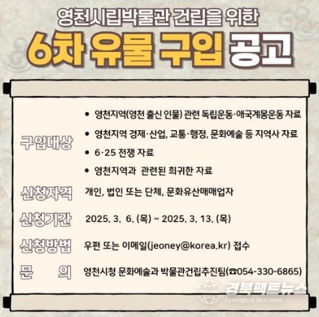 경북팩트뉴스 이경원 기자 | 영천시는 현재 건립 중인 영천시립박물관의 전시·교육·연구 등에 활용할 수 있는 다양한 유물을 수집하고자 공개 구입을 시작한다고 밝혔다.