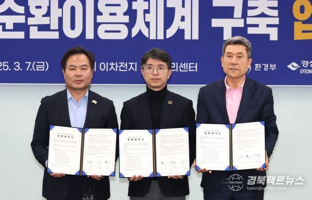 경북팩트뉴스 조현묵 기자 | 경상북도는 7일 포항 블루밸리 국가산업단지에 있는 이차전지 종합관리센터에서 환경부, 포항시와 함께‘배터리 순환이용 체계 구축을 위한 업무협약(MOU)’을 체결했다.