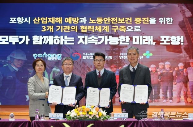 이날 협약식에서 장상길 부시장과 신동술 고용노동부 포항고용노동지청장, 김태완 한국산업안전보건공단 경북동부지사장 등은 지역 내 사업장의 안전관리 강화와 산업안전보건 지원에 협약기관 간 힘을 모으기로 했다.