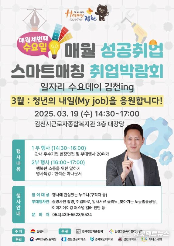 경북팩트뉴스 조현묵 기자 | 김천시는 오는 19일 오후 2시 30분, 김천시근로자종합복지관 3층 대강당에서 ‘2025 매월성공취업 스마트매칭 취업박람회’를 개최한다고 밝혔다.