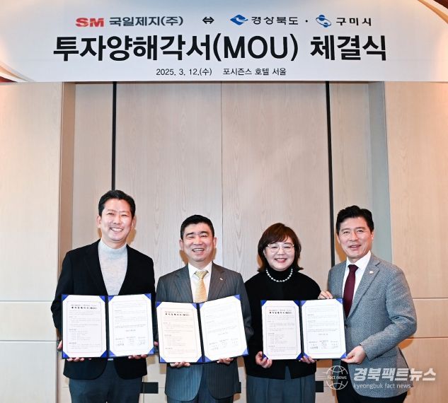 경북팩트뉴스 조현묵 기자 | 경상북도와 구미시는 12일 서울 포시즌즈 호텔에서 특수지 및 산업용지 전문 제조기업 SM국일제지(주)와 구미시에 통합공장 설립 추진을 내용으로 투자 양해각서(MOU)를 체결했다.