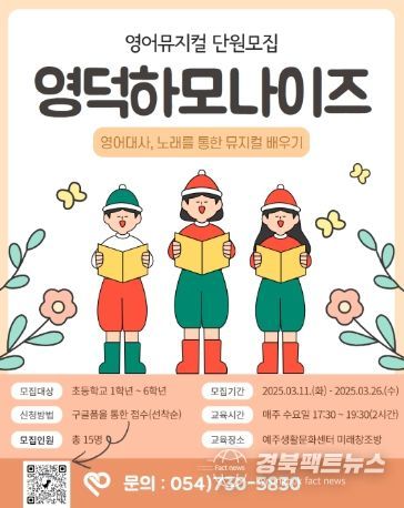 지난 11일 모집을 시작한 어린이 영어 뮤지컬 '영덕 하모나이즈'는 오는 3월 26일 18시까지 신청을 받아 총 15명의 초등학생(1~6학년)을 선발할 예정이다. 최종 선정자는 3월 27일 개별 문자로 안내되고 자세한 사항은 영덕문화관광재단 홈페이지에서 확인할 수 있다. 강좌 신청 및 문의는 영덕문화관광재단 예술진흥팀으로 가능하다.