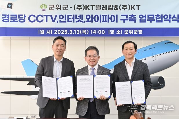 경북팩트뉴스 조현묵 기자 | 군위군은 지난 13일 ㈜KT텔레캅, ㈜KT와 경로당 CCTV,인터넷, 와이파이 설치 및 운영을 위한 업무협약을 체결했다. 이번 협약은 경로당 이용 어르신들의 안전을 강화하고, 보다 체계적인 보안 시스템을 구축하기 위한 목적으로 진행됐다.