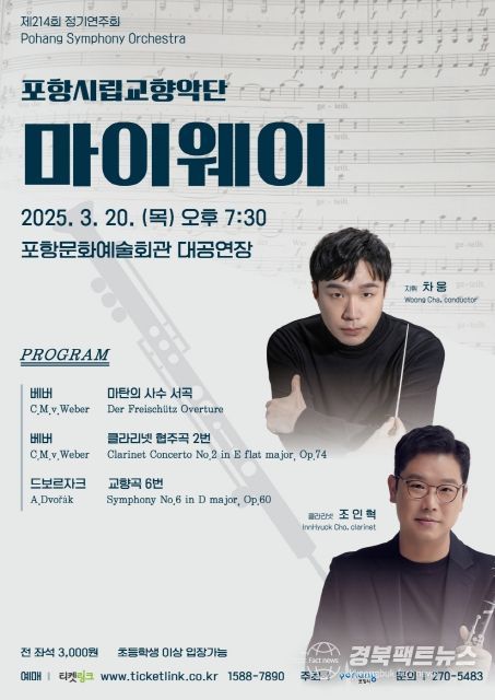이번 공연의 지휘는 포항시립교향악단 예술감독 겸 상임지휘자인 차웅 지휘자가 맡아 베버의 ‘마탄의 사수 서곡’, ‘클라리넷 협주곡 2번’, 드보르자크의 ‘교향곡 6번’을 선보인다.