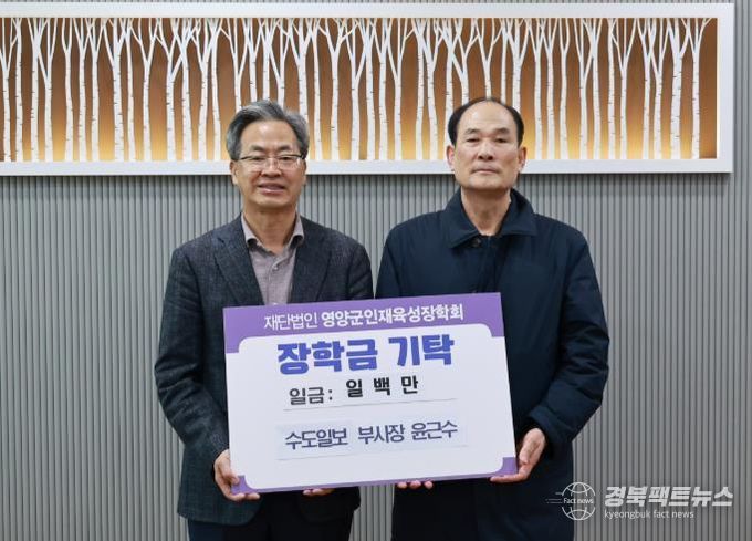 경북팩트뉴스 조현묵 기자 | 영양군은 지난 19일 수도일보 윤근수 부사장이 영양군청을 방문하여 지역인재육성장학금으로 100만 원을 전달했다고 밝혔다.