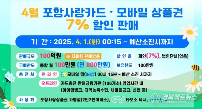 경북팩트뉴스 남유신 기자 | 포항시는 내달 1일부터 100억 원 규모의 카드형·모바일 포항사랑상품권을 7% 할인 판매한다.